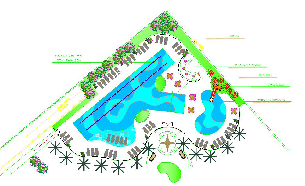 Clubhouse floor plan design in Autocad file detail, Pool bar, biribol, water slide, Children's pool, Adult pool With 25m streak, etc.