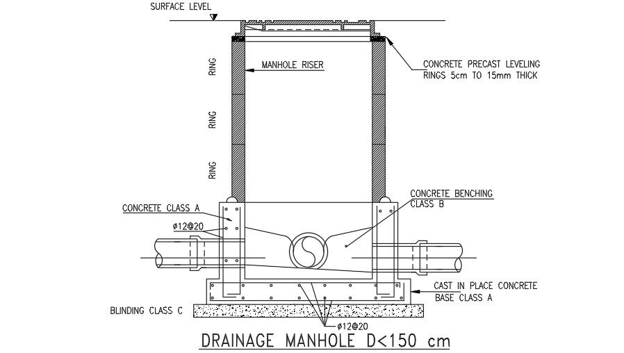 Drainage manhole is given in this AutoCAD drawing model. Manhole riser, concrete benching, surface level, blinding class, and base class are mentioned. For more details download the AutoCAD drawing file for free.