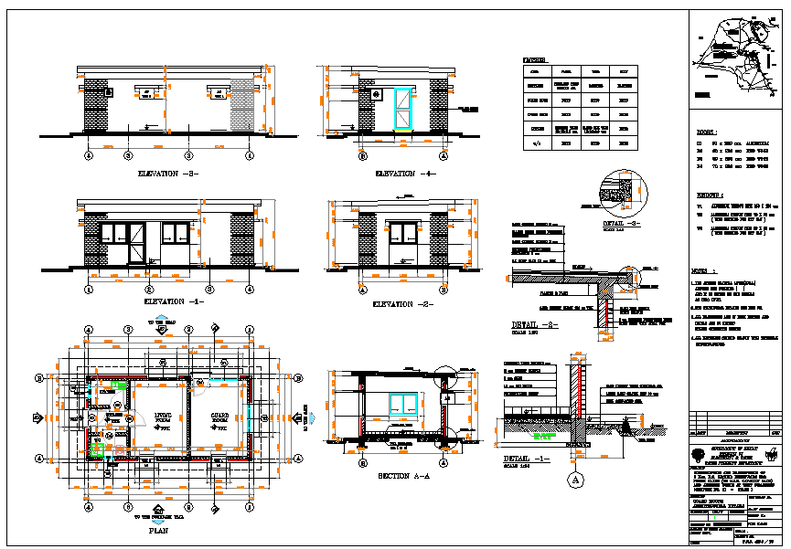 Guard House Design DWG file Detail in plan, section, foundation detail, elevation detail, entrance, guard room, living room, kitchen, w/c.