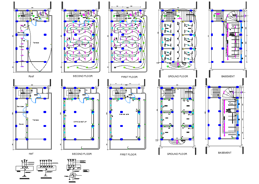 Basement floor plan, ground floor plan, first floor plan, second floor plan, & roof floor plan etc, office setup, internet cafe, sump tank, electric lay-out design.& structure detail.