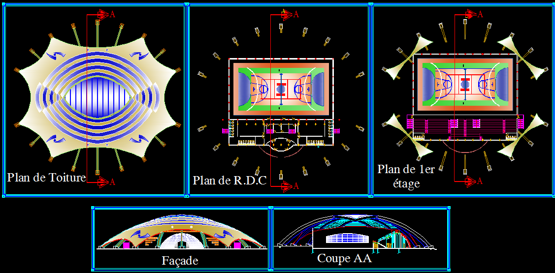 This stadium design CAD drawing provides a detailed and comprehensive architectural layout showcasing roof plans, ground floor, and first-floor plans with precise sectional and elevation details. The structure features a modern, curved roofing system with an advanced tensile fabric design, optimizing light distribution and ventilation within the arena. The layout includes a central sports court, audience seating areas, and supporting facilities, all arranged to ensure smooth circulation and maximum visibility from every angle. The plan also highlights entrance zones, facade detailing, and sectional views (AA) that define the architectural character and functionality of the stadium.