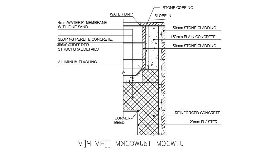 Stonewall section detail cad drawing is given in this cad file. There is a 2d side view and section details are available. The Stonewall section shows RCC detail includes 3 cm plaster, 10 cm h. concrete block, 3 cm thermal insulation, 22 cm stone wall with concrete, 2 cm plaster. For more detail visit our website cadbull.com. Download this 2d cad file now.