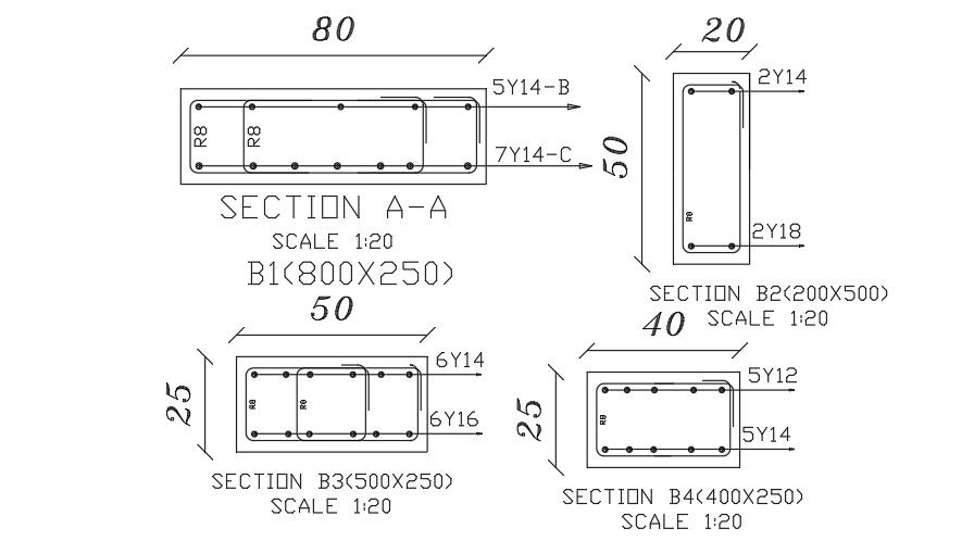 800x250cm beam section view is given in this model. This is given for the 25x10m house plan. The reinforcement details are given in this section. For more details download the AutoCAD file from our website.