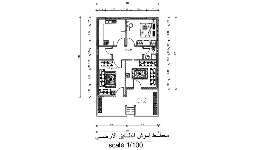 10x8m single story house plan AutoCAD drawing is given in this model. This is a 1bhk house plan. The living room, master bedroom, kitchen, store room, family lounge area, and common bathroom are available. For more details download the AutoCAD drawing file from our website.