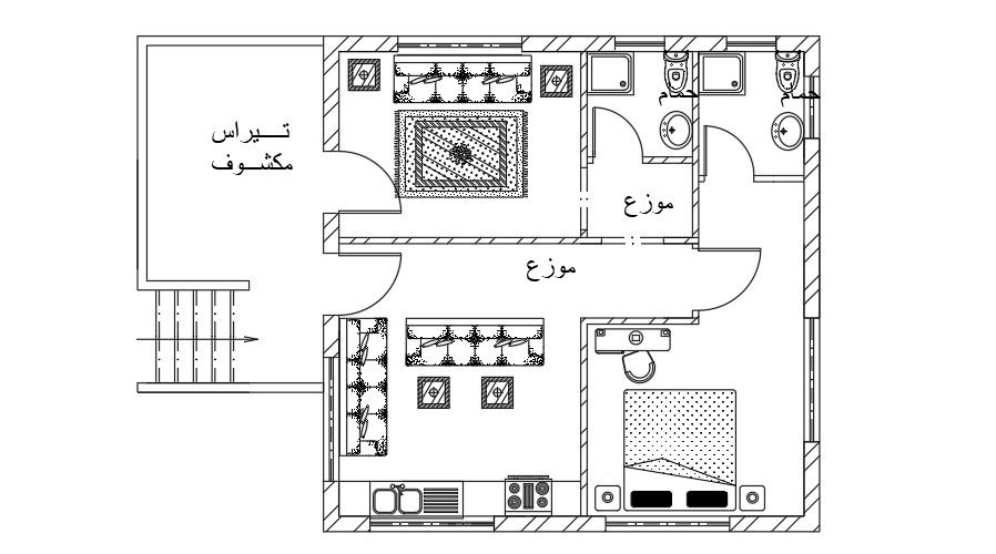 14x8m 1bhk house plan AutoCAD drawing is given in this model. The living rooms, kitchen cum dining area, sit out, master bedroom with the attached toilet, and common bathroom are available. For more details download the AutoCAD drawing file from our website.