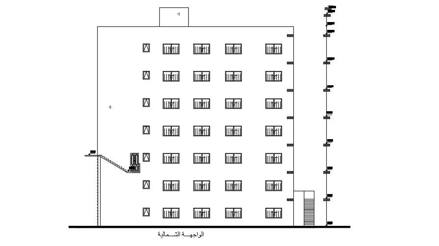 The front elevation view of the 24x14 MEhouse building is given in this AutoCAD model. The height of the building is 20m. Windows, main door, and doors are given. For more details download the AutoCAD file from our website.