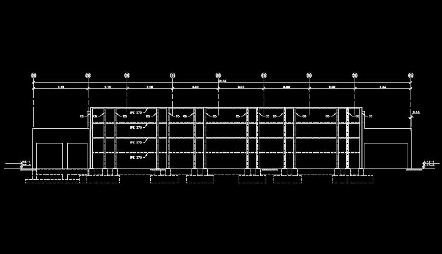 The front section view of the 247x140m industrial building view is given in this AutoCAD model. IPE 270 channel section view is given in this drawing. For more details download the AutoCAD 2D drawing file for free.