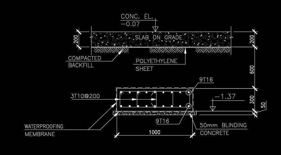 1000x300mm column cross section view is given in this AutoCAD model. 9 numbers of 16mm diameter bars are provided at the bottom and top. For more details download the AutoCAD 2D drawing file for free.