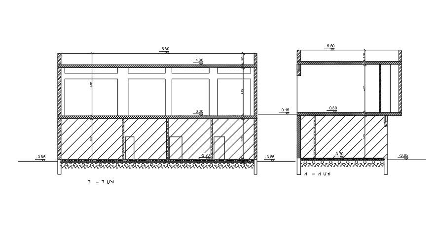 The front and back side section view of the 9x18m store house building AutoCAD drawing is given in this model. This is a single story building. The height of the building is 4.8m. Four stores are available with the attached toilet. For more details download the AutoCAD drawing file.