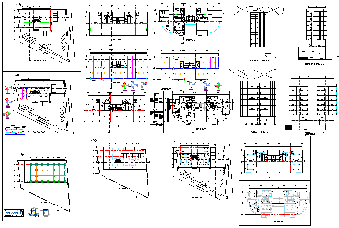 Multistory apartment dwg files. Include plan, elevations, sections, column detail, and ground floor have store
