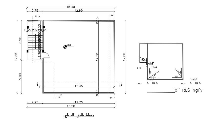 The roof layout of the 15x13m house plan is given in this AutoCAD file. The rain water pipe line slope detail drawing is given. The dimension of the staircase is 6950x2750mm. For more details download the AutoCAD file.