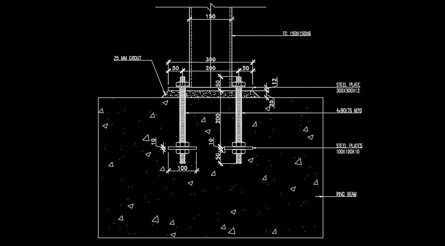 A section view of the 350x300cm footing plan is given in this drawing model. Ring beam is provided in this model. 4 numbers of M20 bolts are provided in this footing. 300x300x12mm steel plate is provided. 25mm grouting is provided. For more details download the AutoCAD drawing file from our website.