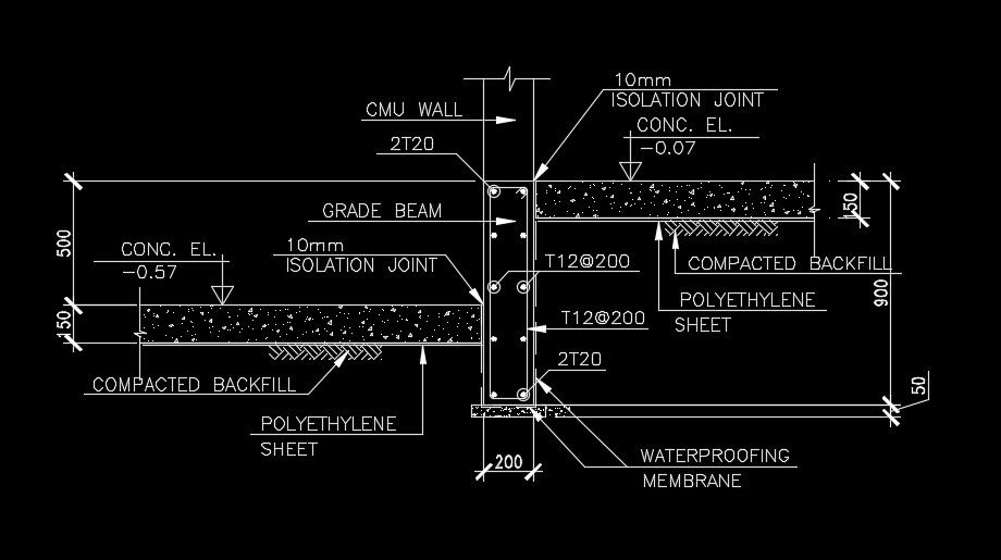 Slab cum CMU wall AutoCAD drawing is given in this model. The cross section of the column is 200x300mm. 12mm diameter of the bar is provided. Grade beam, waterproofing membrane, polyethylene sheet, reinforcement details, compacted backfill, and 50mm blinding concrete is provided. For more details download the AutoCAD drawing file from our website.