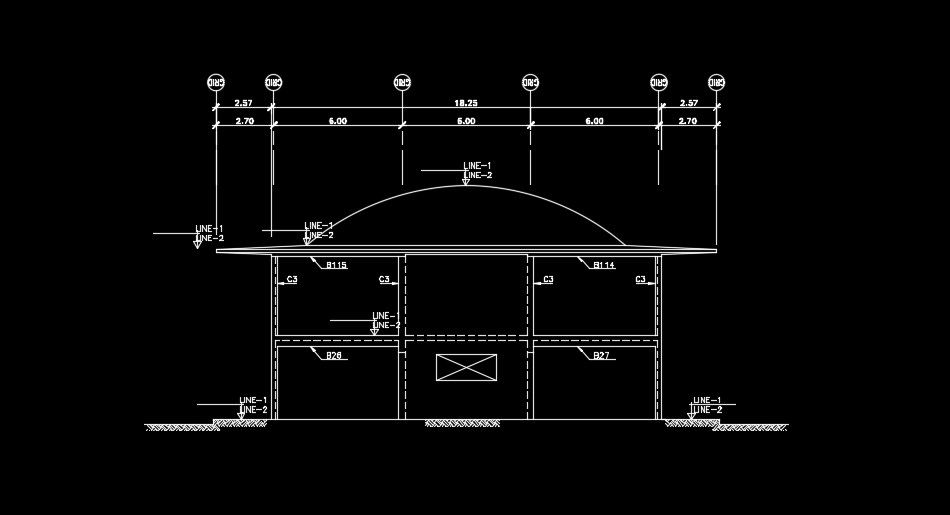 18m length of the mosque front view is given in this AutoCAD file. The column and beams are mentioned. For more details download the AutoCAD drawing file from our website.