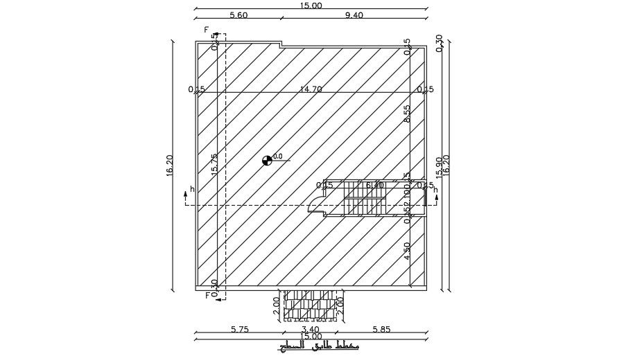 The roof layout of the 15x16m house plan drawing is given. The staircase is provided with a dimension of 6.4x2m. For more details download the AutoCAD drawing file.