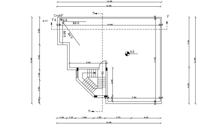 17x14m house plan of the roof floor rainwater slope drawing is given in this AutoCAD file. The length and breadth of the staircase are 5.4m and 4.35m respectively. A hole is provided at the left side corner. For more details download the AutoCAD drawing file.