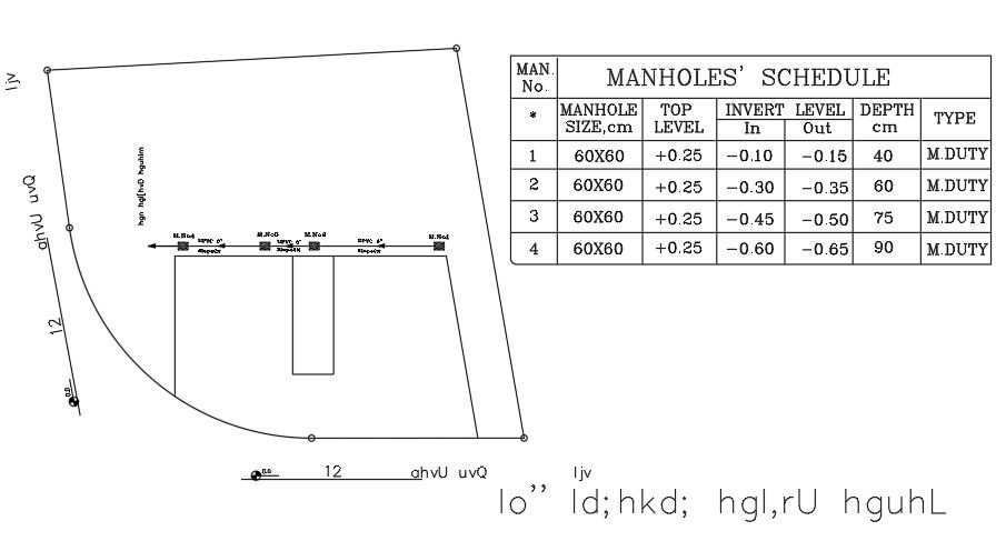 Manhole Plan Of 18x12 Meter House Plan is given in this cad file. There is a 2d plan is available. In this plan, there is manhole detail and inlet-outlet details are also available. In this file Manhole's schedule and branches, diameter is available. Thank you for downloading the AutoCAD drawing file and other CAD program files from our website. Visit CADBULL.COM Site