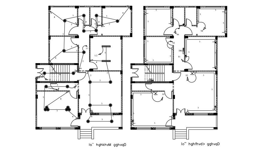 14x17m house plan of the light and switch point location drawing is given in this AutoCAD file. The living room, kitchen, family lounge area with the attached toilet, master bedroom with the attached toilet, kid’s room, guest room, and common bathroom are available. For more details download the AutoCAD drawing file.