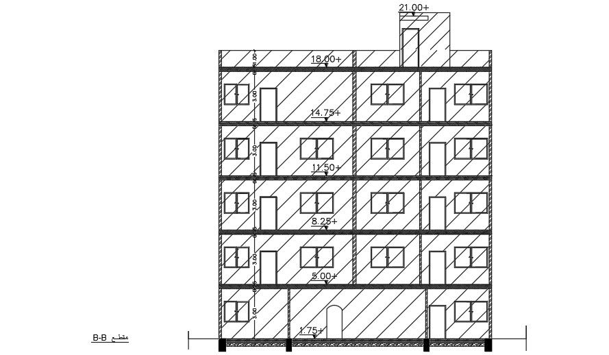 The left side elevation view of the 17x17m house building is given in this file. The total height of the building is 21m. Two houses are available on this plan. On the first house, the living room, master bedroom, kid’s room, kitchen, and common bathroom are available. On the second house, the living room, kitchen, master bedroom with balcony and attached toilet, kid’s room, and common bathroom are available. For more details download the AutoCAD drawing file.