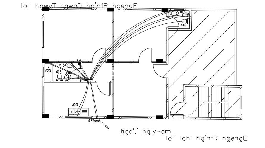 16x8m house plan of the plumbing layout drawing is given in this AutoCAD model. The pipe lines are provided to the attached bathroom, common bathroom, and kitchen. For more details download the AutoCAD drawing file.