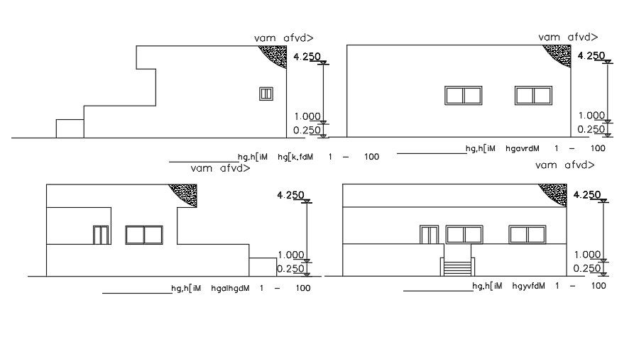 An elevation view of the 8x12m house building is given in this AutoCAD file. The height of the building is 4.25m. The living room, kitchen, master bedroom, kid’s room, and common bathroom are available. For more details download the AutoCAD drawing file.