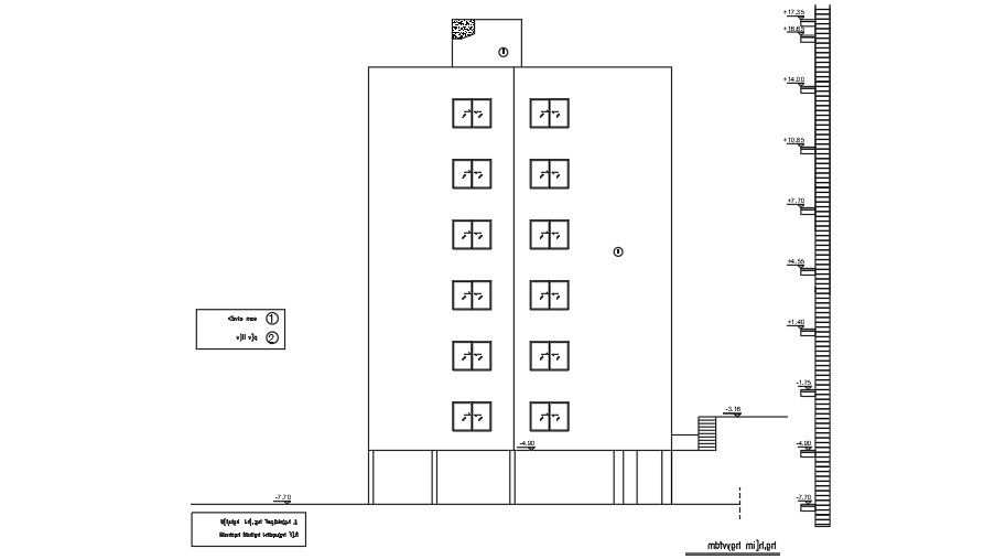 The back side elevation view of the 18x16m house building is given in this AutoCAD file. The total height of the apartment building is 17.35m. This is G+ 6 apartment building. Two houses are available on each floor. The living room, kitchen, dining area, family lounge, master bedroom, guest room, kid’s room, and two common bathrooms are available. For more details download the AutoCAD drawing file.