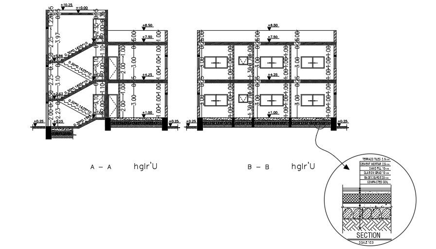 A section view of the 12x11m house building is given in this AutoCAD file. The total height of the building is 10.02m. This is G+ 1 house building. The left side elevation view is given. For more details download the AutoCAD drawing file.