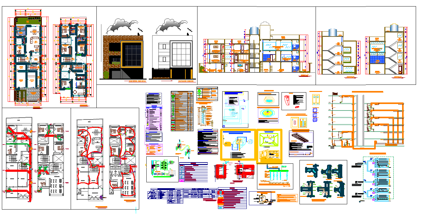 multi family house plans in autocad dwg files, include presentations plan with furniture, elevations, sections, joint and constructions detail.