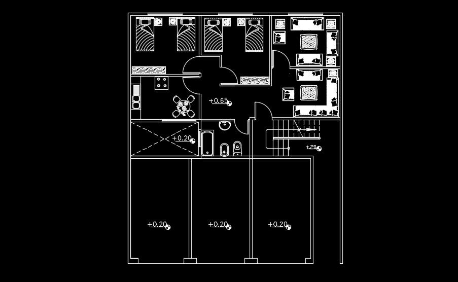 Ground floor layout of the 12x14m home plan is given in this AutoCAD drawing model. On this plan, one house is available. The living room, kitchen, master bedroom, kid’s room, family lounge area, and common bathrooms are availabl. For more details download the AutoCAD file for free from our website.