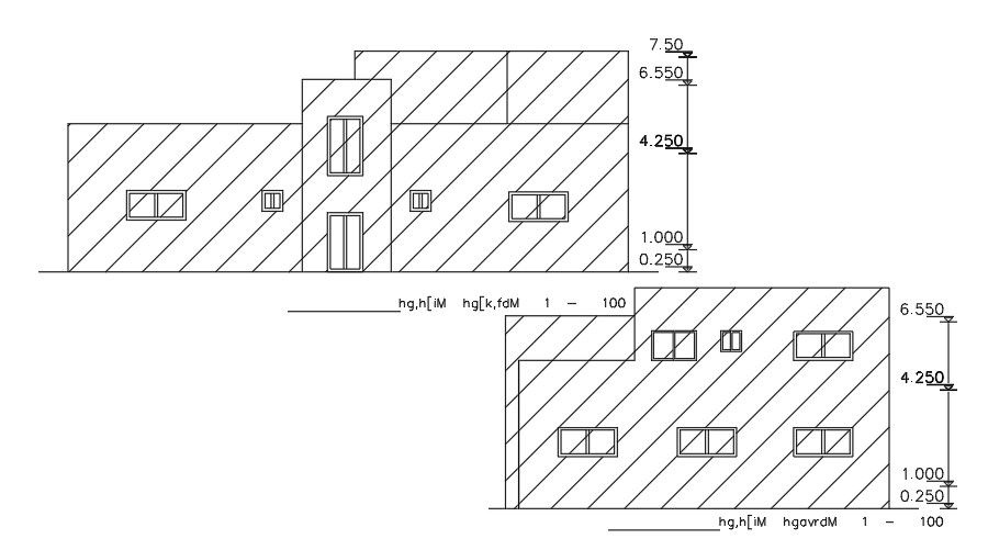 19x13m house building AutoCAD elevation view is given in this file. The total height of the building is 7.5m. This is a G+ 1 house building. For more details download the AutoCAD drawing file from our website.