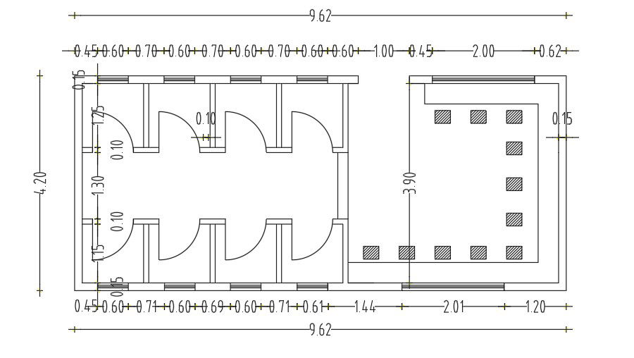 9x5m public toilet plan 2D AutoCAD drawing is given in this file. Totally 8 bathrooms are available. For more details download the AutoCAD file from our website.