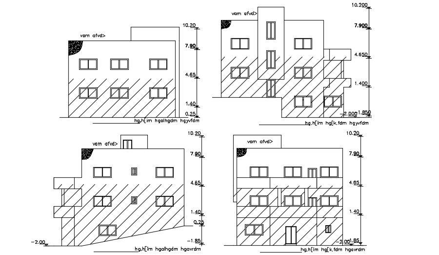 Elevations Of House Building DWG File shown in the file. House Building AutoCAD files are shown in this drawing file. The House Building elevations of the building include window and door sizes. Thank you for downloading the AutoCAD drawing file and other CAD program files from our website. Visit CADBULL.COM Site.