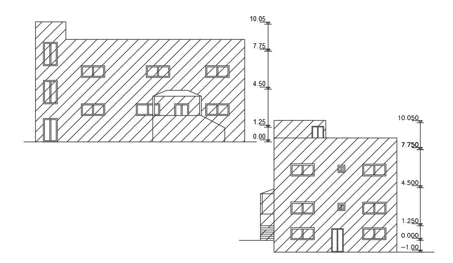 18x12m house building elevation view is given in this AutoCAD file. The total height of the building is 10.05m. On the ground floor, 1bhk house is available. 3bhk houses are available on the first and second floor. For more details download the AutoCAD drawing file from our website.