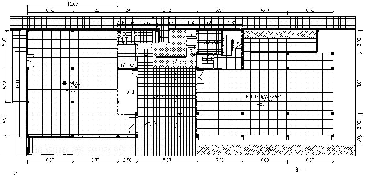 Shopping Center Floor Plan shows a 40x14 meter size. 40x14 Meter Shopping Center Floor Plan includes column placement, atm, mini market, and staircase is available. centerline plan is also available in this file. 40x14 Meter Shopping Center Floor Plan dimensions are in a meter. Thank you for downloading the AutoCAD drawing file and other CAD program files from our website. Visit CADBULL.COM Site.