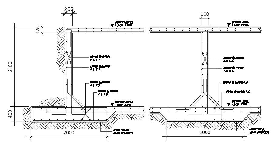 2000x400mm footing section drawing is given in this AutoCAD model. The total height of the column is 2100mm. 50mm thickness of the lean concrete is provided. Reinforcement details are mentioned. For more details download the AutoCAD drawing file from our website.
