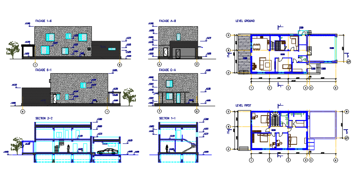 the modern house plan shows ground floor includes a drawing room, dining area, kitchen, toilet, bedroom. On the second floor 2 bedrooms with an attached toilet, balcony, storeroom, and passage. The inside staircase is also available in this file. In modern houses DWG File sections and elevations are available. , Thank you for downloading the AutoCAD drawing file and other CAD program files from our website