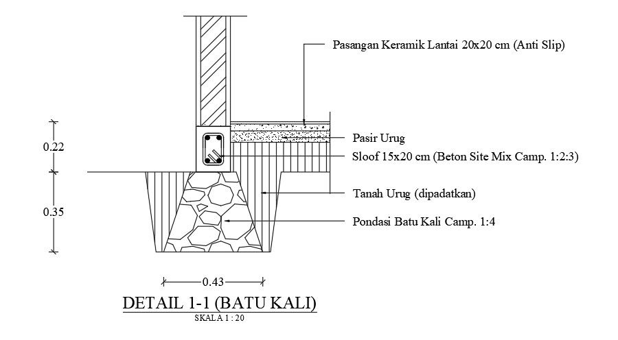 3x3m toilet building foundation section view is given in this AutoCAD model. The river stone, 20x20cm ceramic floor pair, and reinforcement details are mentioned. For more details download the AutoCAD drawing file from our website.