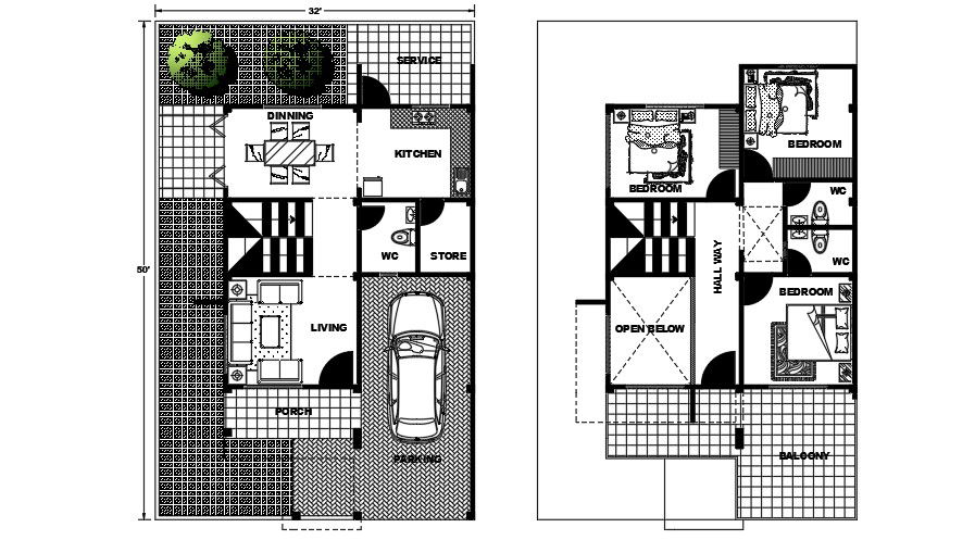 32'x50' 3 BHK House AutoCAD Plan Layout File