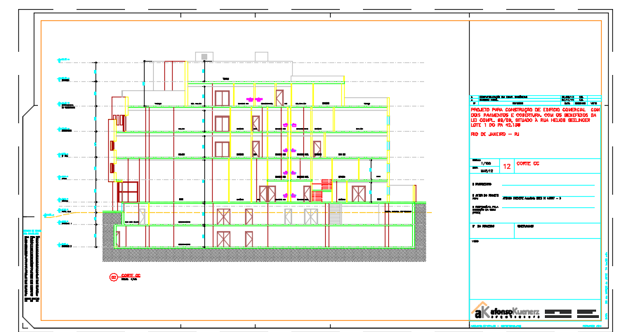 The front section view of the 34x50m commercial building drawing is given in this file. This is G+ 6 commercial building. The ground floor is provided for rest rooms. Rest of the floors is provided for the stores. For more details download the AutoCAD drawing file from our website.