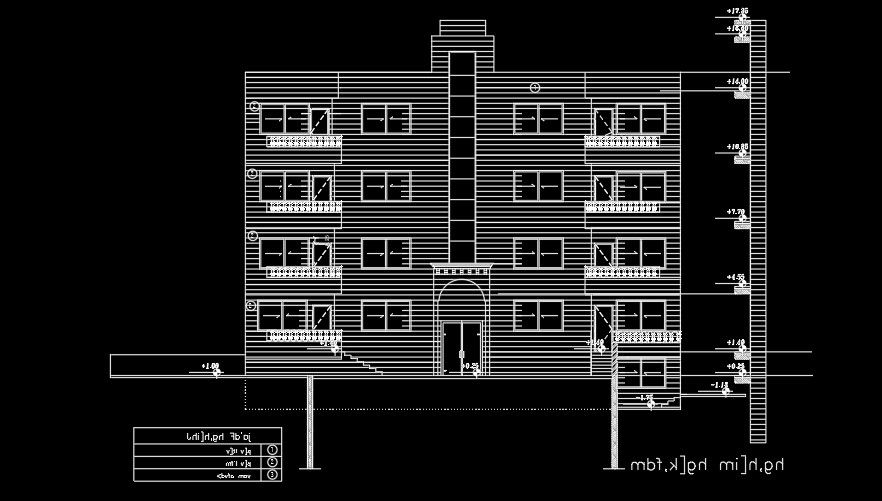 The front elevation view of the 18x18m house building is given in this AutoCAD file. This is G+ 4 house building. The total height of the building is 17.35m. For more details download the AutoCAD file from our cadbull website.