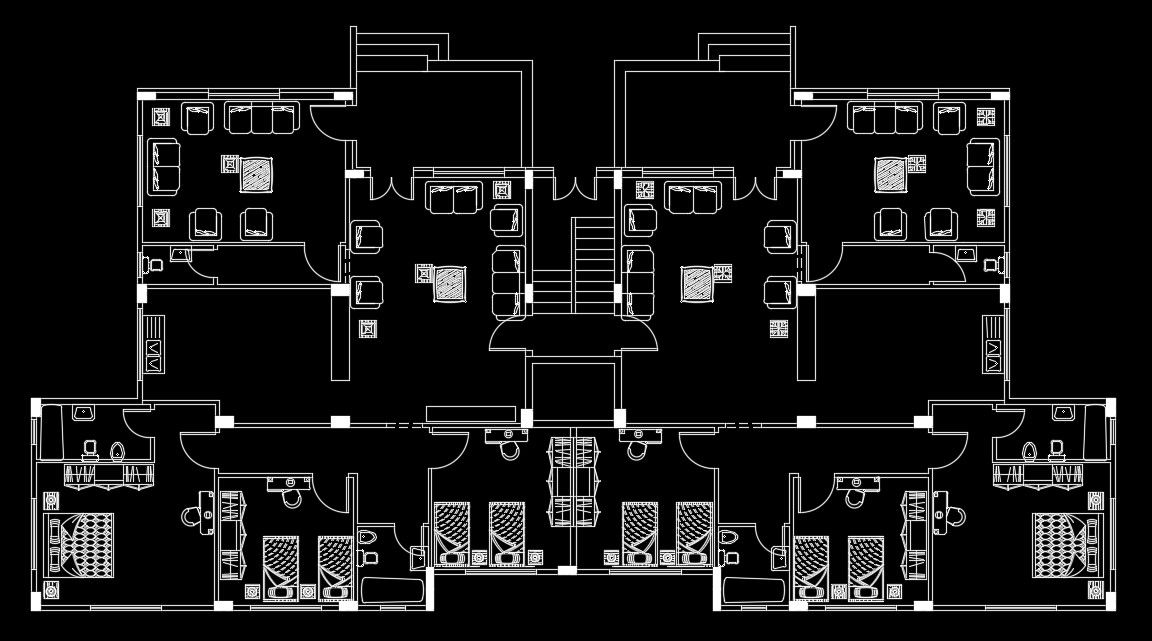 Architecture Twin House 30x15m Furniture Layout DWG file