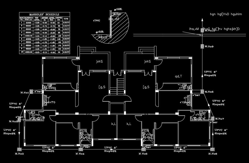 30x15m house plan manhole AutoCAD drawing is given in this file. Totally 10 manholes are provided. 6” UPVC pipe is provided to all man holes. The manholes are connected from kitchen, and all bathrooms. For more details download the AutoCAD drawing file from our website.