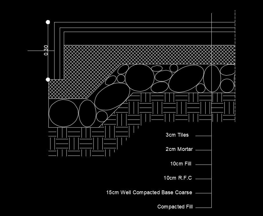 20x10m house plan footing construction drawing is given in this AutoCAD model. 3cm tiles, 2cm mortar, 10cm fill, 2cm mortar, and other details are mentioned. For more details download the AutoCAD drawing file from our website.