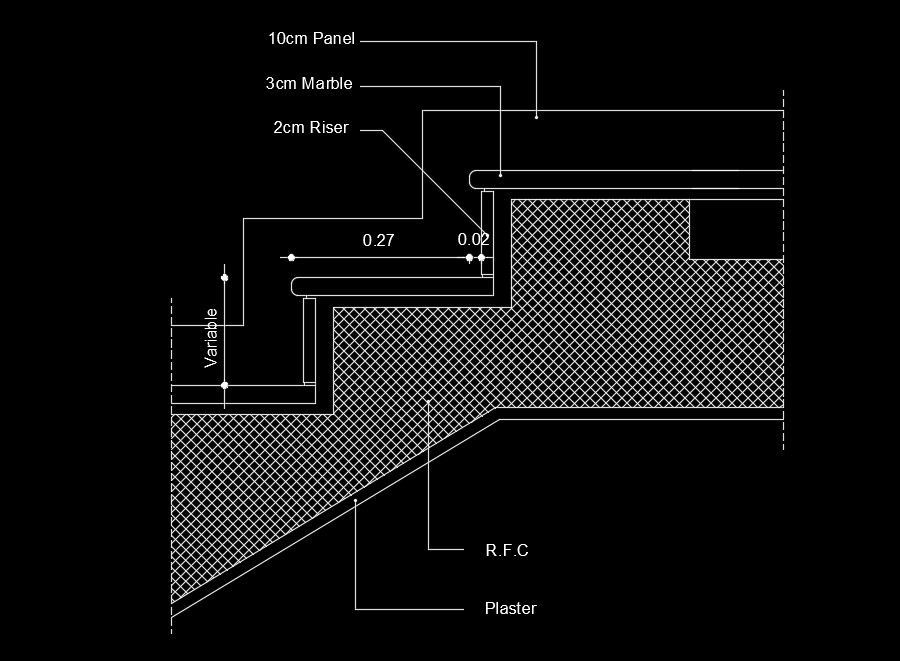 20x10m house plan staircase riser and thread drawing is given in this AutoCAD file. The height of the riser is 200mm. The length of the thread is 0.27m. Thickness of the plaster is 2cm. For more details download the AutoCAD drawing file from our website.