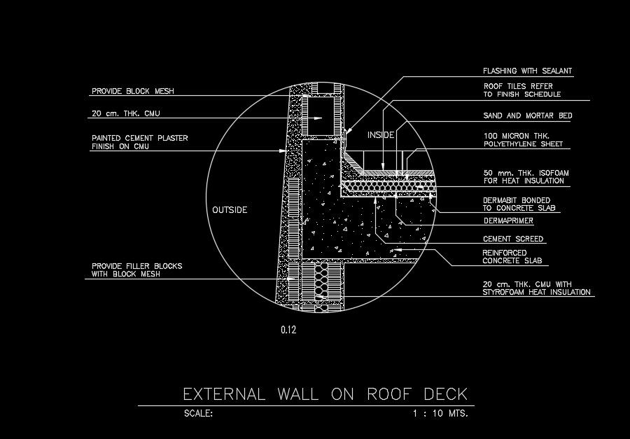 External wall on roof deck AutoCAD drawing is given in this file. 20cm block mesh, painted cement plaster, flashing with sealant, cement screed, and other details are mentioned. For more details download the AutoCAD drawing file from our website.