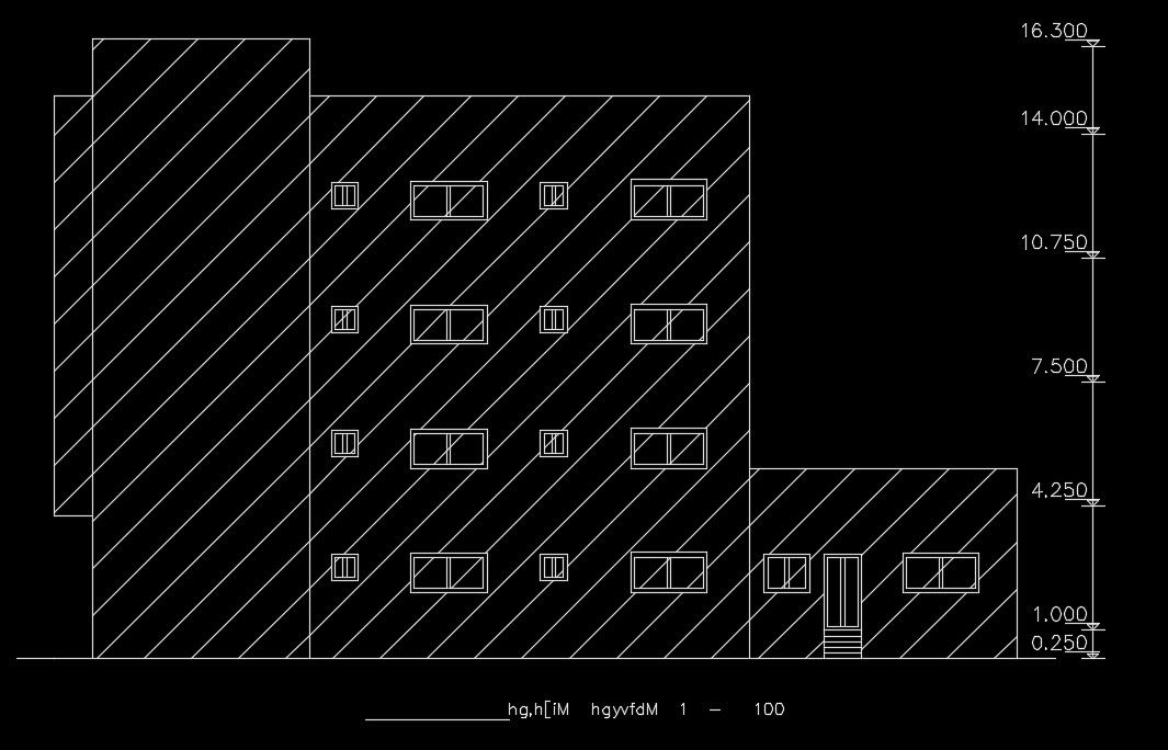 10x25m house building left side elevation view is given in this AutoCAD drawing model. This is G+ 3 house building. The total height of the building is 16.3m. The door, and windows are visible in this elevation view. For more details download the AutoCAD drawing file from our website.
