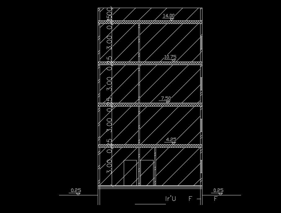 10x25m house building left side section view is given in this AutoCAD drawing model. This is G+ 3 house building. The total height of the building is 16.3m. The door, and windows are visible in this elevation view. For more details download the AutoCAD drawing file from our website.
