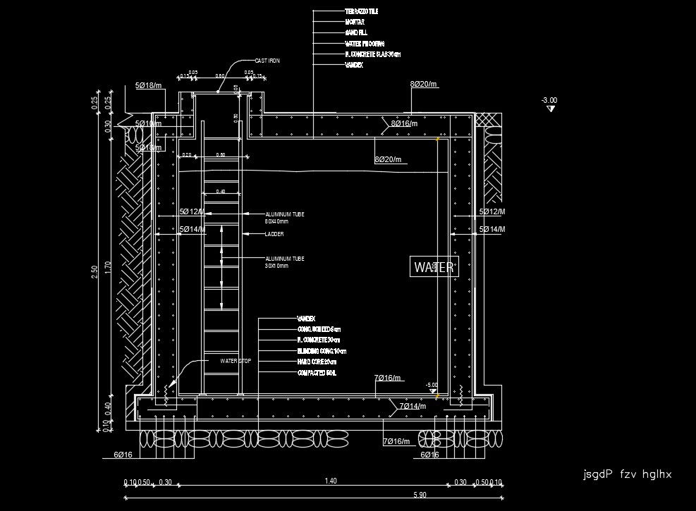 16x21m house plan water tank section view is given in this AutoCAD drawing model. The length and breadth of the water tank is 5.5m and 2.75m respectively. Reinforcement details are given clearly in this drawing. The ladder is provided. For more details download the AutoCAD drawing file from our website.