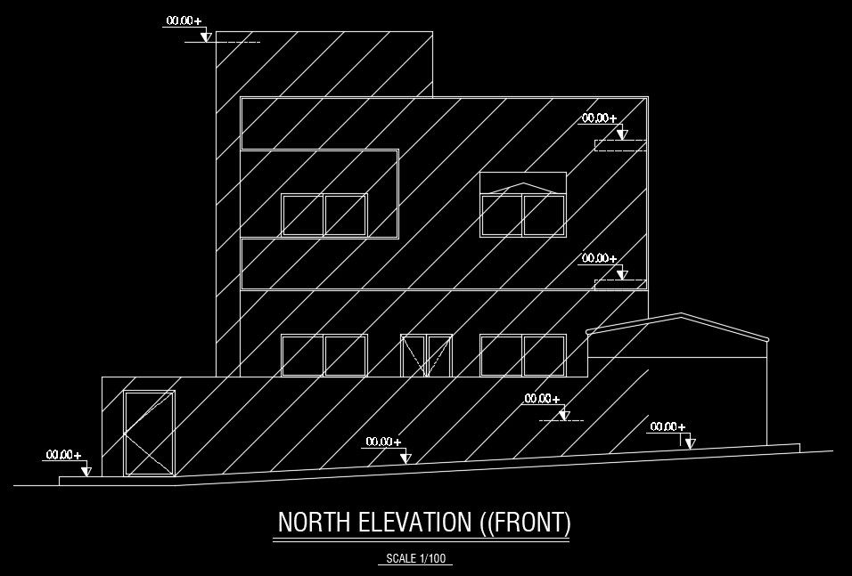 The north side elevation view of the 22x10m house building is given in this file. This is G+ 1 house building. The total height of the building is 7.5m. On each floor, two houses are available with 2bhk and 3bhk. For more details download the AutoCAD drawing file from our website.