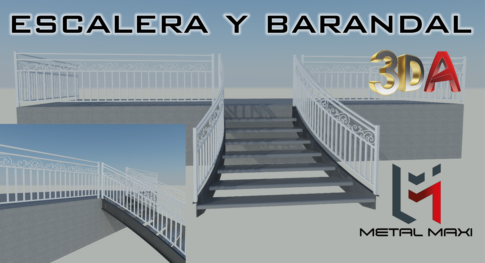 escalera y baranda en AutoCAD 3d con detalles de hierro forjado una ya tiene materiales y esta en una versión 2021 , esta modelado a cada detalle